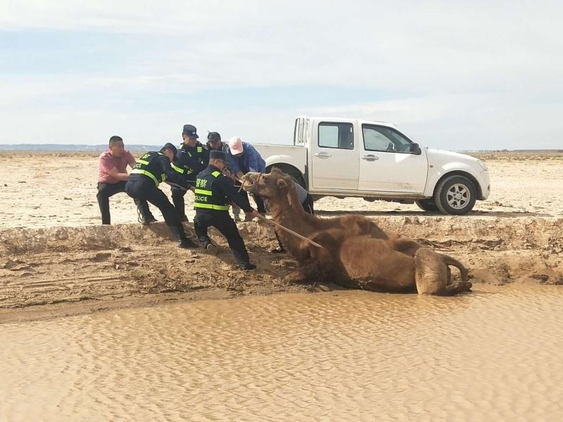 無獨(dú)有偶。當(dāng)日下午,阿拉善左旗蘇宏圖邊境派出所也接到群眾報(bào)警:稱其一峰駱駝陷入泥潭無法脫身,請求救助。民警趕到現(xiàn)場后發(fā)現(xiàn)這是一峰懷孕母駝,在飲水時不慎滑入泥潭,由于浸泡許久,已經(jīng)無法站立。民警當(dāng)即采取措施,在避免肚子受傷害的前提下,將兩條繩子分別固定在駱駝前肢與后肢,再利用人力拖拽,經(jīng)過2個小時的救援,成功將母駝救出。(牛鑫 梁鎮(zhèn) 于鶴偉)
