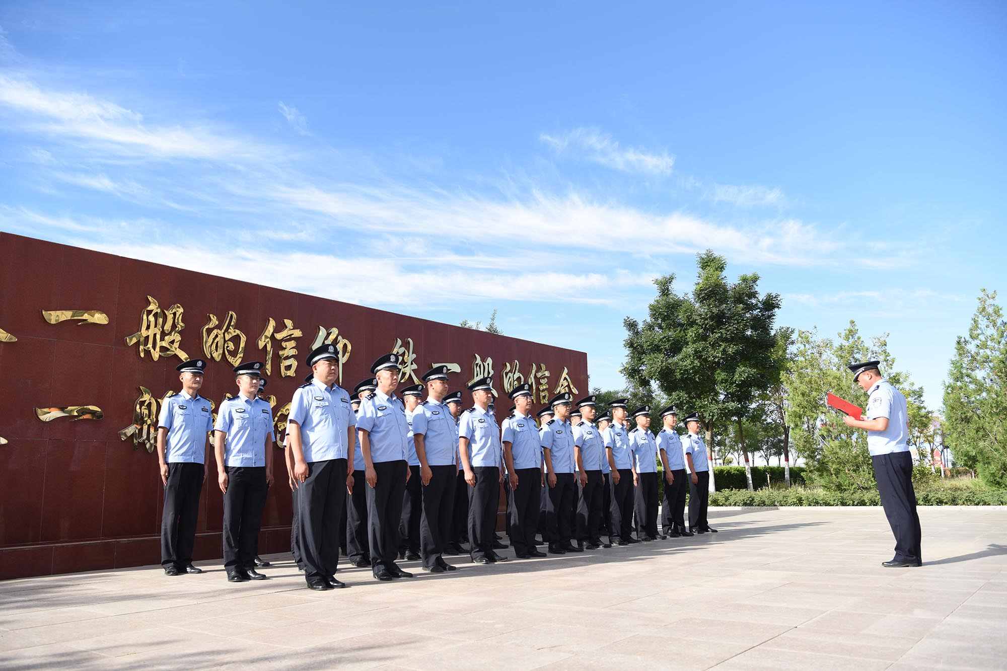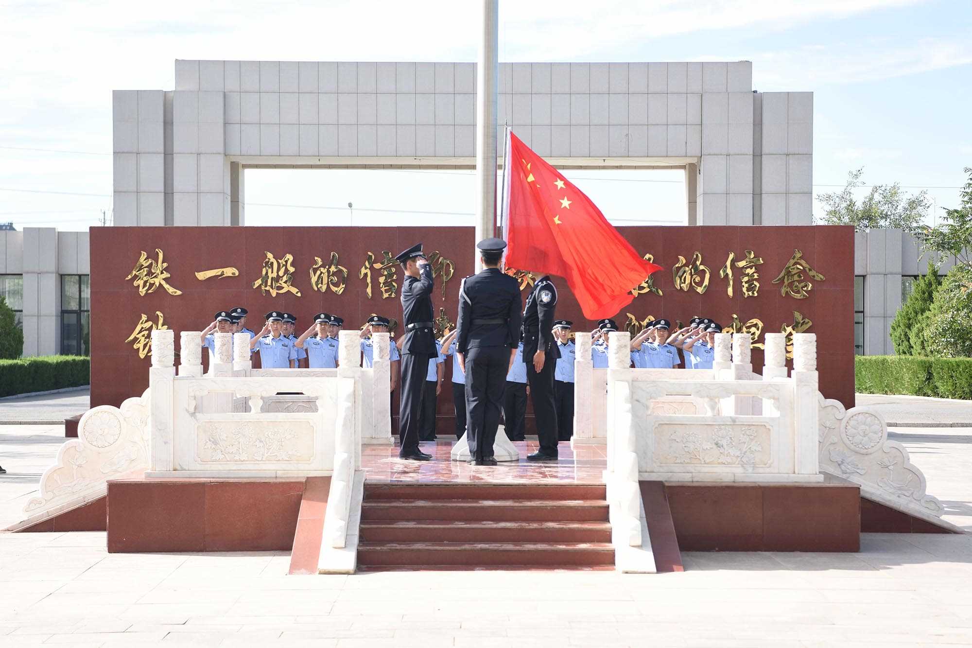 上午9時整,升國旗儀式正式開始,全體民警在國旗臺前整齊列隊,鮮艷的五星紅旗在激揚雄壯的義勇軍進行曲中冉冉升起,全體民警精神抖擻、身姿挺拔,向冉冉升起的五星紅旗莊嚴敬禮,表達了對祖國母親的崇高敬意以及為黨的事業(yè)奮斗終身的壯志豪情。隨后,全體民警高舉右拳,面對國旗莊嚴宣誓:“我志愿成為中華人民共和國人民警察,獻身于崇高的人民公安事業(yè)……為維護社會大局穩(wěn)定、促進社會公平正義、保障人民安居樂業(yè)而努力奮斗!”鏗鏘有力的誓言在營區(qū)中久久回蕩,莊嚴的誓詞再一次銘刻在每名民警心中?;顒悠陂g,全體民警還觀看了習(xí)近平等黨和國家領(lǐng)導(dǎo)人在中國人民抗日戰(zhàn)爭紀念館為抗戰(zhàn)烈士敬獻花籃儀式。
