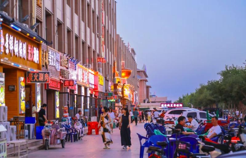 走進(jìn)達(dá)來呼布鎮(zhèn)各主要街道,濃濃的煙火氣撲面而來。不少餐廳門口支起熱鬧的夜市攤位,游客們圍坐在一起,品嘗駝肉、羊肉等當(dāng)?shù)靥厣朗?,歡聲笑語不斷。