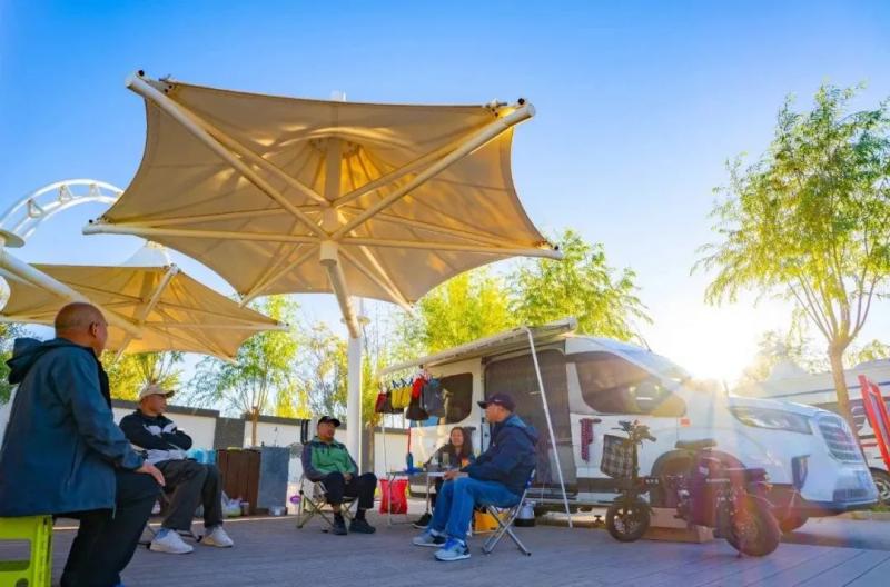 在額濟(jì)納旗居延驛站,不少自駕游旅客搭起帳篷、支起飯桌,三五好友圍坐在一起,盡情探索“露營+”新玩法。旅游旺季期間,居延驛站全力保障車位供給,配備完善的水電系統(tǒng),著力提升游客體驗(yàn)感?!斑@里不僅風(fēng)光獨(dú)特,而且旅游設(shè)施完善、服務(wù)周到,真是不虛此行。”來自上海的“摩旅發(fā)燒友”云楓連連稱贊。
