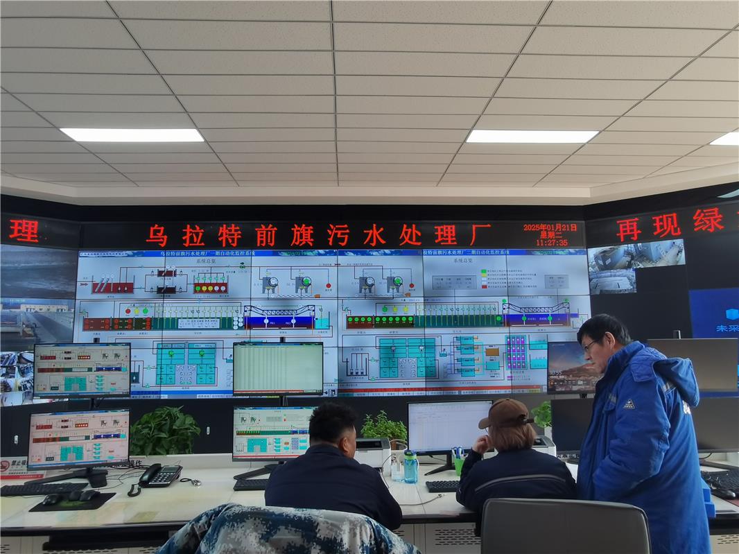 烏拉特前旗污水處理廠總控室。該廠通過智能化在線監(jiān)測,確保污水處理全過程嚴格達標。2024年,共處理污水558萬噸,日均處理量達到1.53萬噸,達標率為98.9%。處理后的中水達到國家一級A標準,主要用于電廠、水務(wù)企業(yè)、道路灑掃和濕地生態(tài)補水等,實現(xiàn)了水資源的再利用。在水資源循環(huán)利用方面作出了積極貢獻。