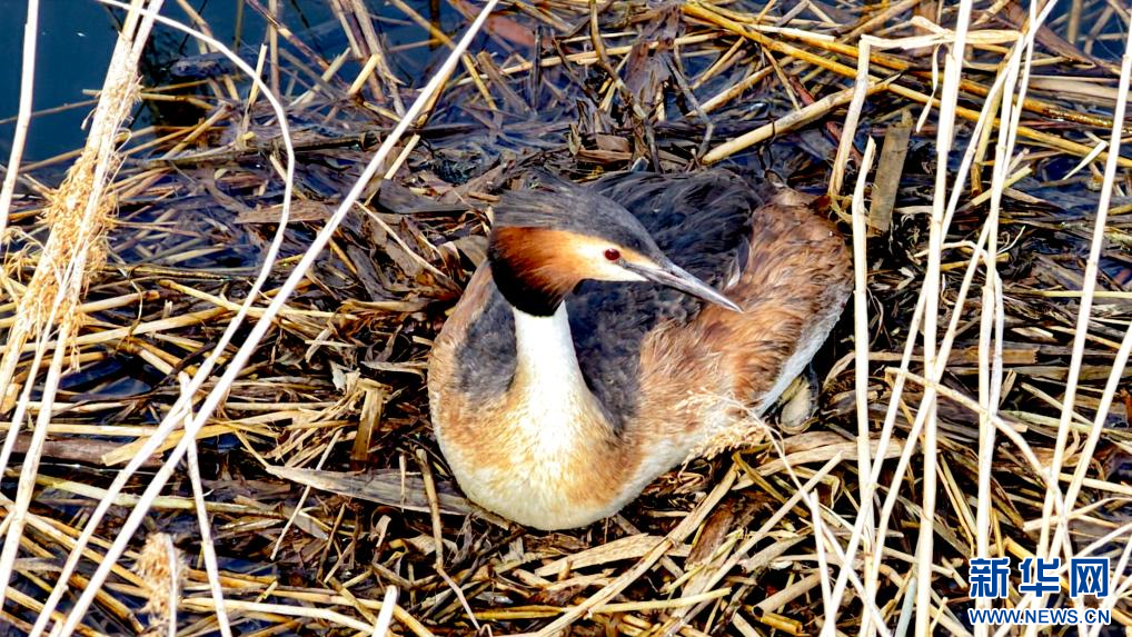 5月29日,在赤峰市松山區(qū)銀河谷濕地,鳳頭鸊鷉在巢中孵化幼鳥。