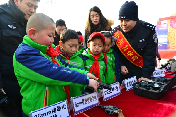 1月10日,民警為小朋友們講解槍支警械。當(dāng)日,是全國第33個“110宣傳日”,呼和浩特市公安局在如意廣場開展了“110宣傳日”活動?,F(xiàn)場,戰(zhàn)鷹突擊隊民警向市民介紹了槍支警械以及常用裝備,四旋翼無人機(jī)、定位儀、微光夜視儀等先進(jìn)設(shè)備。活動讓群眾零距離接觸了難得一見的特種裝備,搭建起警民互動橋梁,增強(qiáng)市民的安全感。