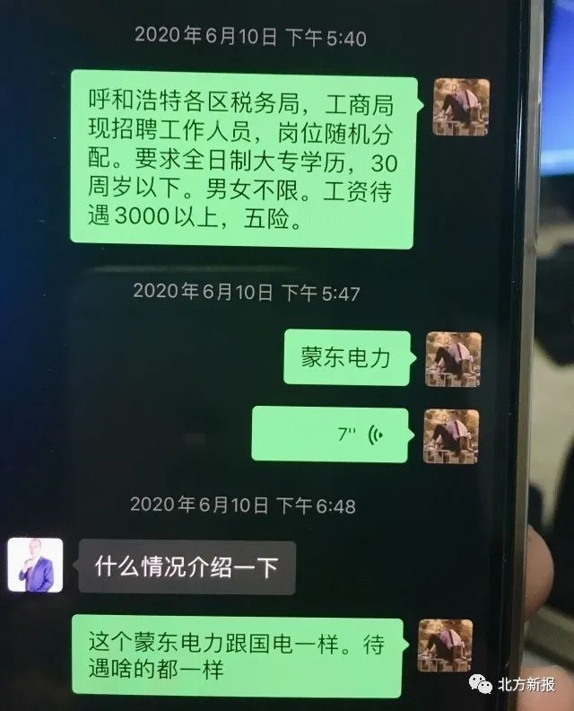 “呼和浩特各區(qū)消防大隊(duì)招聘辦公室內(nèi)勤人員,工資待遇3500元左右。”“高速交警呼市支隊(duì)(一支隊(duì))輔警,工資和五險(xiǎn)一金,4200元。”“呼和浩特各區(qū)稅務(wù)局、工商局現(xiàn)招聘工作人員,崗位隨機(jī)分配?!薄昂艉秃铺貗D幼保健院招聘護(hù)士,大專學(xué)歷”……記者在民警繳獲的程某某的手機(jī)上看到,6月8日以來,程某某和趙某某的聊天記錄中,發(fā)送了多條諸如此類的招聘信息。