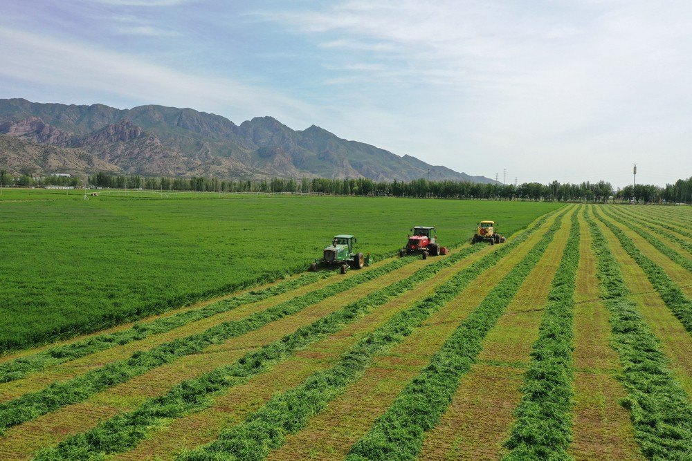 6月4日上午,位于敕勒川生態(tài)綠廊內(nèi)的呼和浩特市土默特左旗國家農(nóng)業(yè)示范區(qū)(兵州亥)苜?;?200畝紫花苜蓿頭茬開鐮收割。