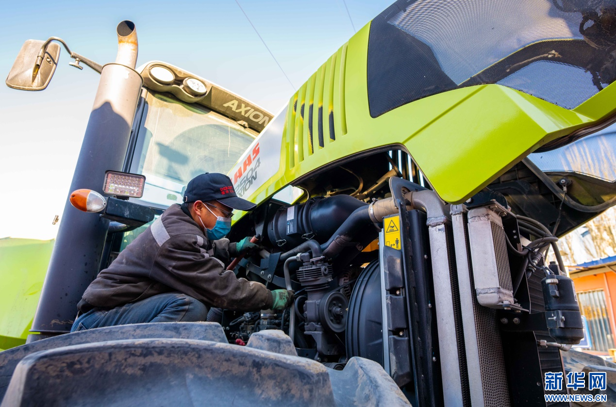 ??2月18日,在位于呼和浩特市玉泉區(qū)的一家農(nóng)機設備公司農(nóng)機具維修區(qū),工作人員在為當?shù)氐霓r(nóng)戶檢修拖拉機。新華網(wǎng)發(fā)(丁根厚 攝)