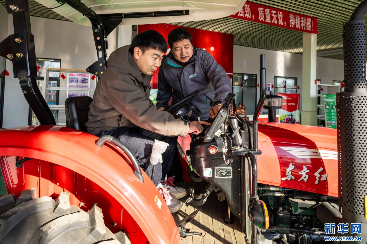 ??2月18日,在位于呼和浩特市玉泉區(qū)的一家農(nóng)機設備公司展銷大廳,農(nóng)戶在咨詢選購拖拉機。新華網(wǎng)發(fā)(丁根厚 攝)