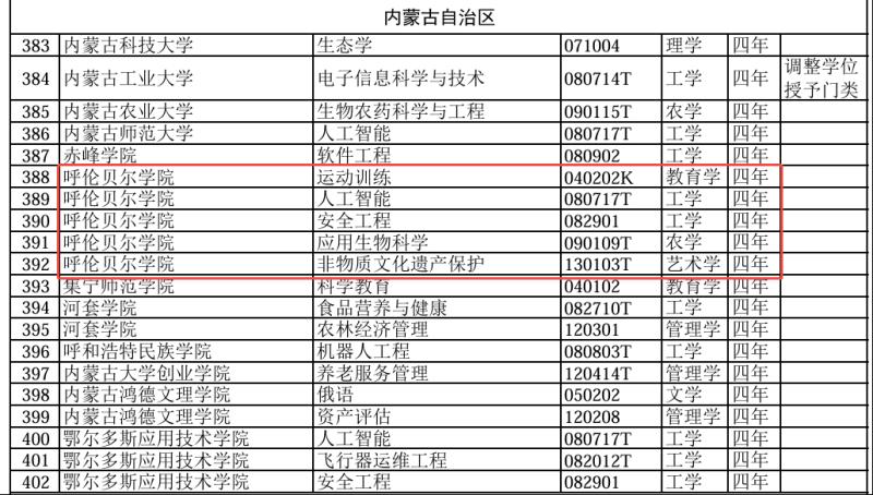 近日,教育部公布了《2024年度普通高等學校本科專業(yè)備案和審批結(jié)果》,其中,呼倫貝爾學院申報的“運動訓練”(專業(yè)代碼040202K,教育學)、“人工智能”(專業(yè)代碼080717T,工學)、“安全工程”(專業(yè)代碼082901,工學)、“應用生物科學”(專業(yè)代碼090109T,農(nóng)學)、“非物質(zhì)文化遺產(chǎn)保護”(專業(yè)代碼130103T,藝術(shù)學)5個本科專業(yè)成功獲批。本次備案和審批的相關(guān)專業(yè),擬列入該校2025年本科招生計劃。