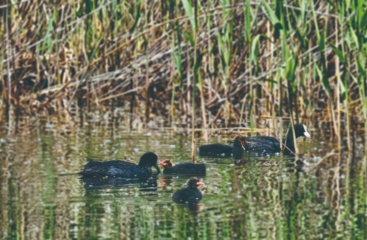 在不遠(yuǎn)處的水域,白骨頂雞一家成為眾人關(guān)注的焦點(diǎn)。幾只剛剛出窩的幼鳥(niǎo),圓滾滾、毛茸茸的,正好奇地在水中游動(dòng),動(dòng)作略顯笨拙,還不時(shí)發(fā)出稚嫩的叫聲。成年白骨頂雞則忙著覓食,它們一頭扎進(jìn)水里,再浮出水面時(shí),嘴里已叼著小魚(yú)小蝦,隨后快速游向幼鳥(niǎo)喂食。幼鳥(niǎo)們爭(zhēng)搶食物的場(chǎng)景,充滿了趣味。