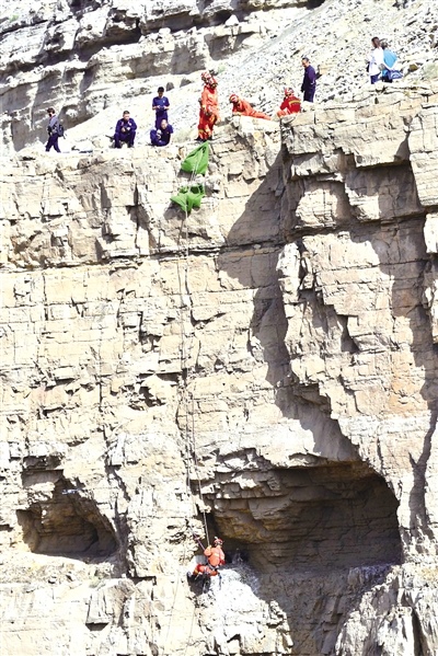 當(dāng)天7時左右,在烏海市海勃灣區(qū)甘德爾山景區(qū)半山腰處,攝影愛好者焦長青在拍攝時發(fā)現(xiàn)了一窩出生20多天的幼年野生黑鸛,其中一只黑鸛行動異常,疑似受傷。他立即撥打了119報警電話,同時聯(lián)系了烏海市野生動物保護(hù)部門。9時許,烏海市消防支援支隊光明路特勤站和烏海市野生動物保護(hù)部門的工作人員到達(dá)現(xiàn)場。經(jīng)勘查,在距離懸崖正下方大約30米處的巖洞內(nèi),一只幼年黑鸛被尼龍繩纏繞住腿部而受傷,不能行動。消防員隨后尋找合適的位置制作錨點(diǎn)。消防員陳意攜帶救援裝備速降到懸崖下方展開營救,一個小時之后,受傷的幼年黑鸛被成功救出,并送往海勃灣區(qū)林業(yè)草原局救助站進(jìn)行救治。