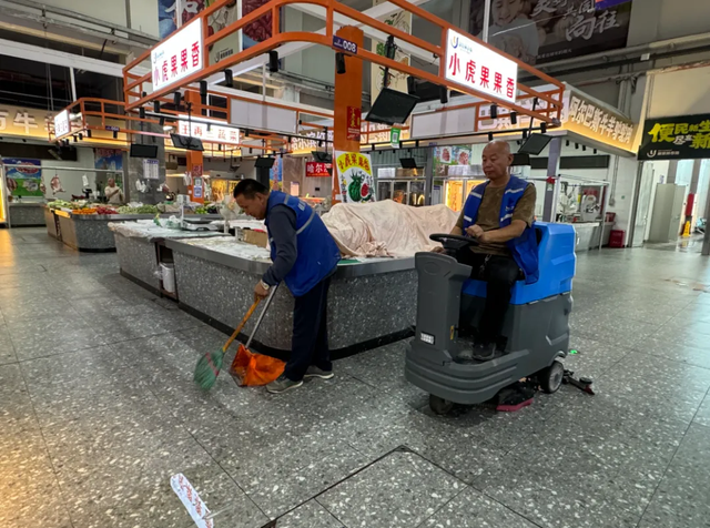 記者在現(xiàn)場(chǎng)看到,市場(chǎng)內(nèi)燈火通明,幾名保潔人員正在細(xì)致地擦拭攤位,有的則在清掃地面上的雜物。而在市場(chǎng)的主通道上,工作人員羅全貴正開(kāi)著洗地機(jī)緩緩前行,機(jī)器過(guò)后,原本有些油污的地面變得干凈整潔。