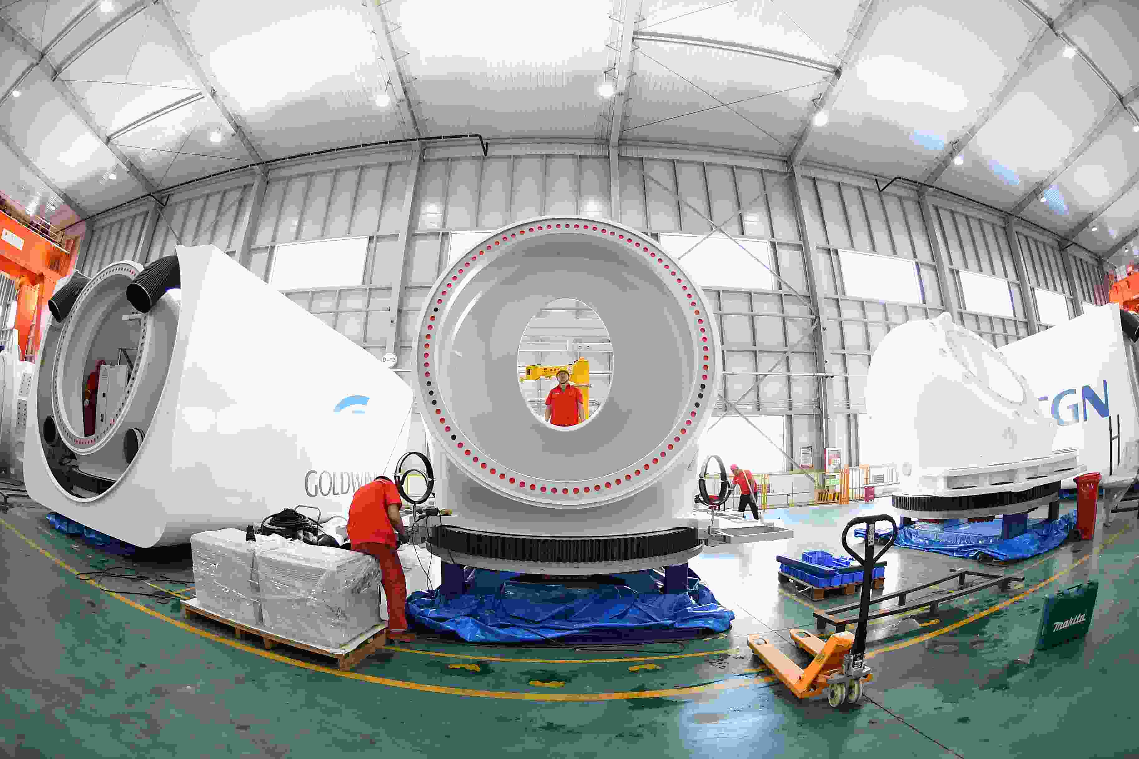 金風科技公司工人在安裝風機主機。邱金鵬攝