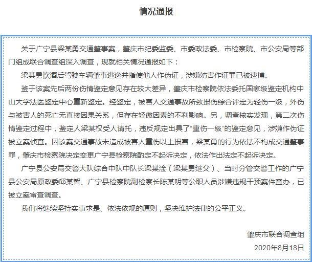 廣寧縣公安局交警大隊綜合中隊中隊長梁某淦(梁某勇繼父)、當時分管交警工作的廣寧縣公安局原政委邱某智、廣寧縣檢察院副檢察長陳某明等公職人員涉嫌違規(guī)干預案件查辦,已被立案審查調(diào)查。
