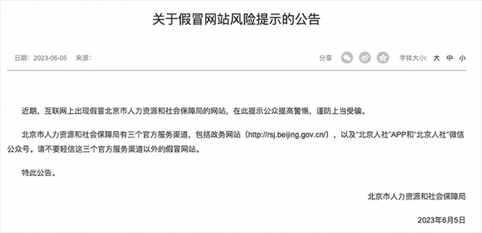 ·北京人社局就近期出現(xiàn)假冒網(wǎng)站發(fā)布風險提示。