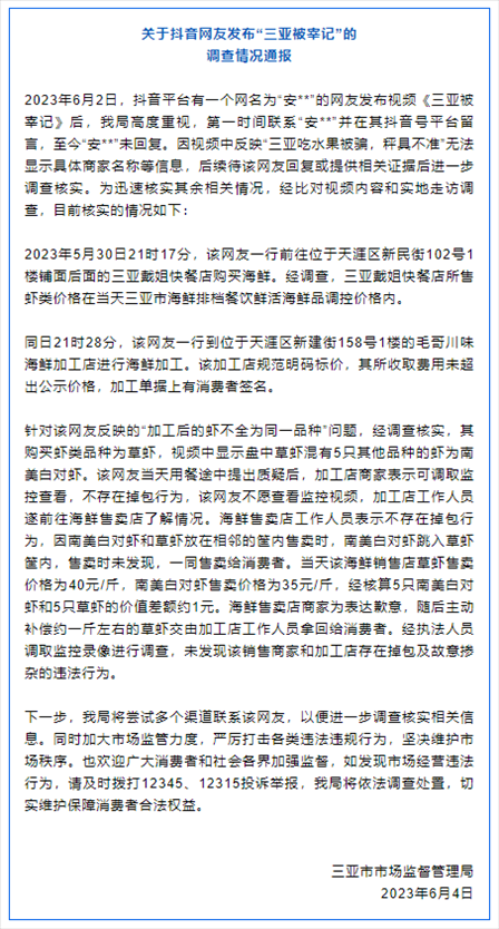 ·網(wǎng)友發(fā)布“三亞被宰記”,三亞通報調(diào)查情況。