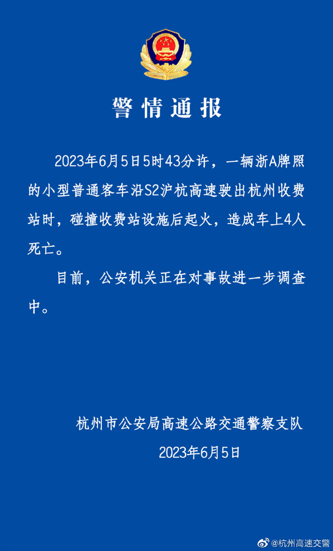 ·杭州高速交警通報:一小客車碰撞收費站起火致4人死亡。