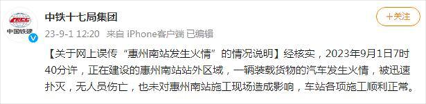 ·中鐵十七局集團(tuán)發(fā)布對(duì)“惠州南站發(fā)生火情”的說(shuō)明:一輛裝載貨物的汽車(chē)發(fā)生火情,被迅速撲滅,未造成人員、財(cái)產(chǎn)傷亡。