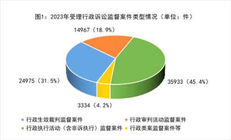 1.行政檢察監(jiān)督職能全面發(fā)展。一方面,訴訟內(nèi)監(jiān)督進一步強化。2023年全國檢察機關(guān)共受理行政訴訟監(jiān)督案件79209件,其中,行政生效裁判監(jiān)督案件24975件,占比31.5%;行政審判活動監(jiān)督案件14967件,占比18.9%;行政執(zhí)行活動(含非訴執(zhí)行)監(jiān)督案件35933件,占比45.4%;行政類案監(jiān)督等案件3334件,占比4.2%。另一方面,“訴訟外”監(jiān)督實現(xiàn)新突破。2023年辦理行刑反向銜接案件中對被不起訴人應受行政處罰的提出檢察意見11.3萬人,辦理行政違法行為監(jiān)督案件提出檢察建議3.2萬件。行政檢察各項職能發(fā)展更加全面、更加協(xié)調(diào)。針對行政訴訟、行政執(zhí)法和執(zhí)行活動存在的問題,以抗訴、檢察建議等方式提出監(jiān)督意見17.4萬件。