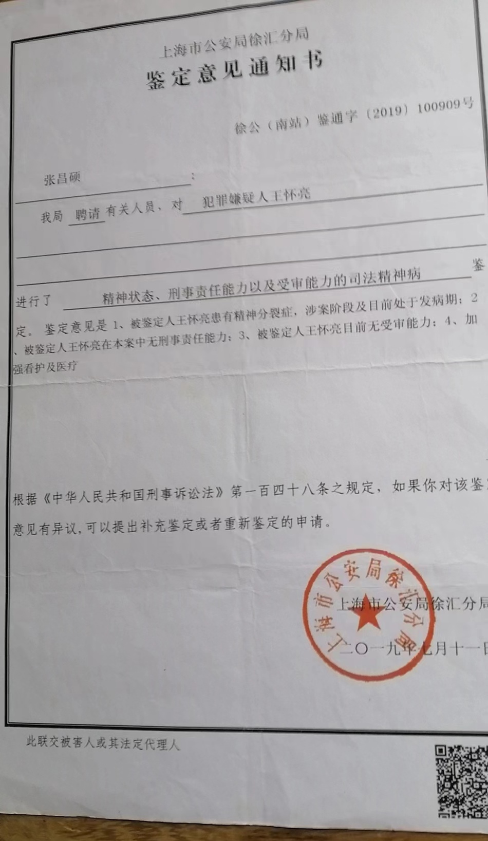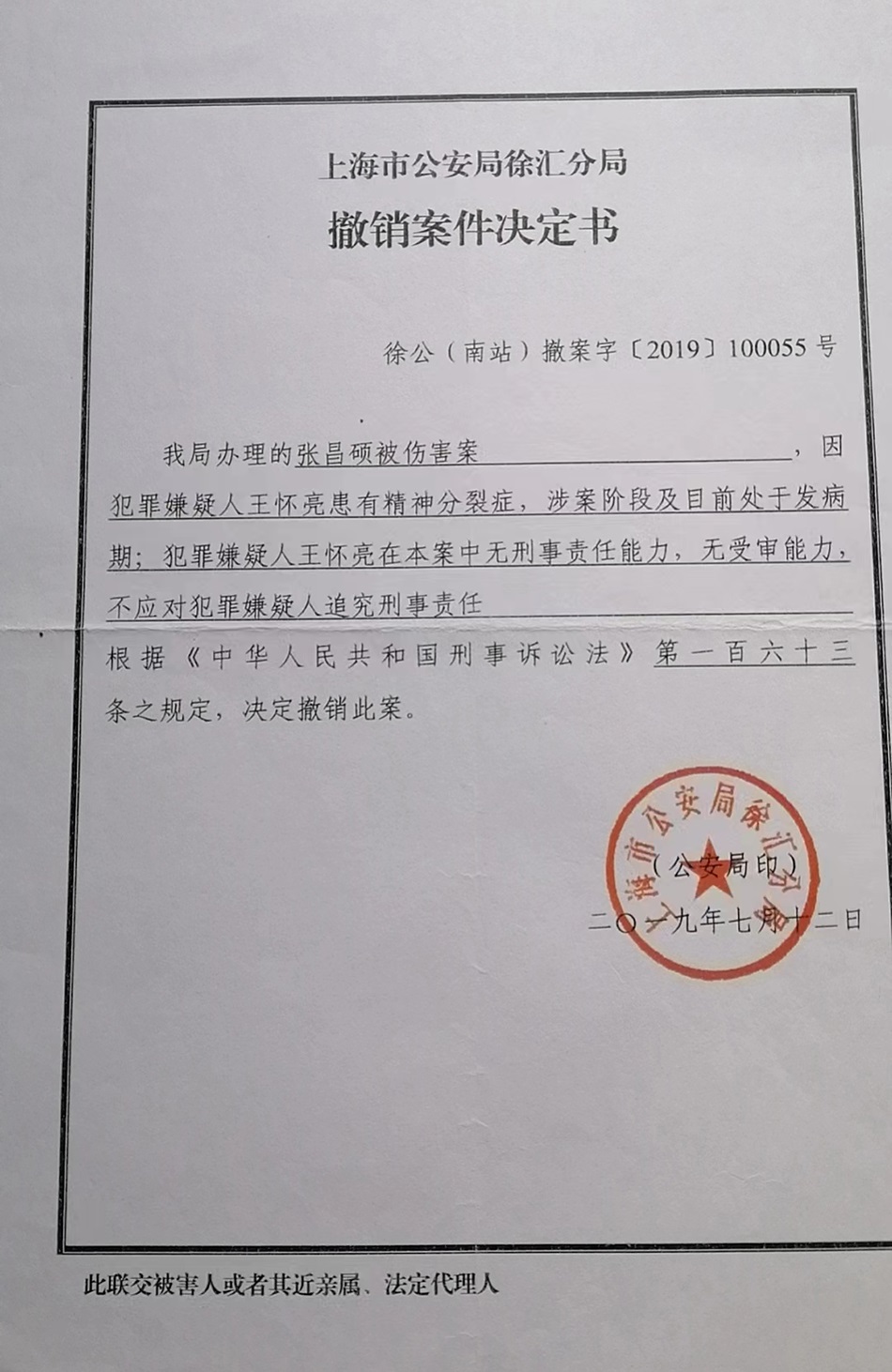 張宏銀回憶,他已經(jīng)不記得這起依法不負(fù)刑事責(zé)任的精神病人強(qiáng)制醫(yī)療程序案件開庭審理的具體時(shí)間,只記得是2019年下半年的一天上午,那天犯罪嫌疑人沒有到場,律師也沒有到場,檢察院的兩位人員出席了開庭。徐匯區(qū)法院當(dāng)庭做出判決:王懷亮被送往醫(yī)療機(jī)構(gòu)進(jìn)行強(qiáng)制醫(yī)療。2019年7月12日,張宏銀收到公安局的撤銷案件決定書。