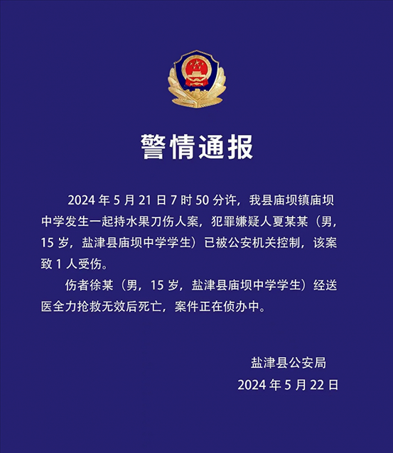 央視網(wǎng)消息:云南鹽津縣公安局通報(bào),5月21日7時(shí)50分許,鹽津縣廟壩鎮(zhèn)廟壩中學(xué)發(fā)生一起持水果刀傷人案,犯罪嫌疑人夏某某(男,15歲,鹽津縣廟壩中學(xué)學(xué)生)已被公安機(jī)關(guān)控制,該案致1人受傷。傷者徐某(男,15歲,鹽津縣廟壩中學(xué)學(xué)生)經(jīng)送醫(yī)全力搶救無(wú)效后死亡,案件正在偵辦中。