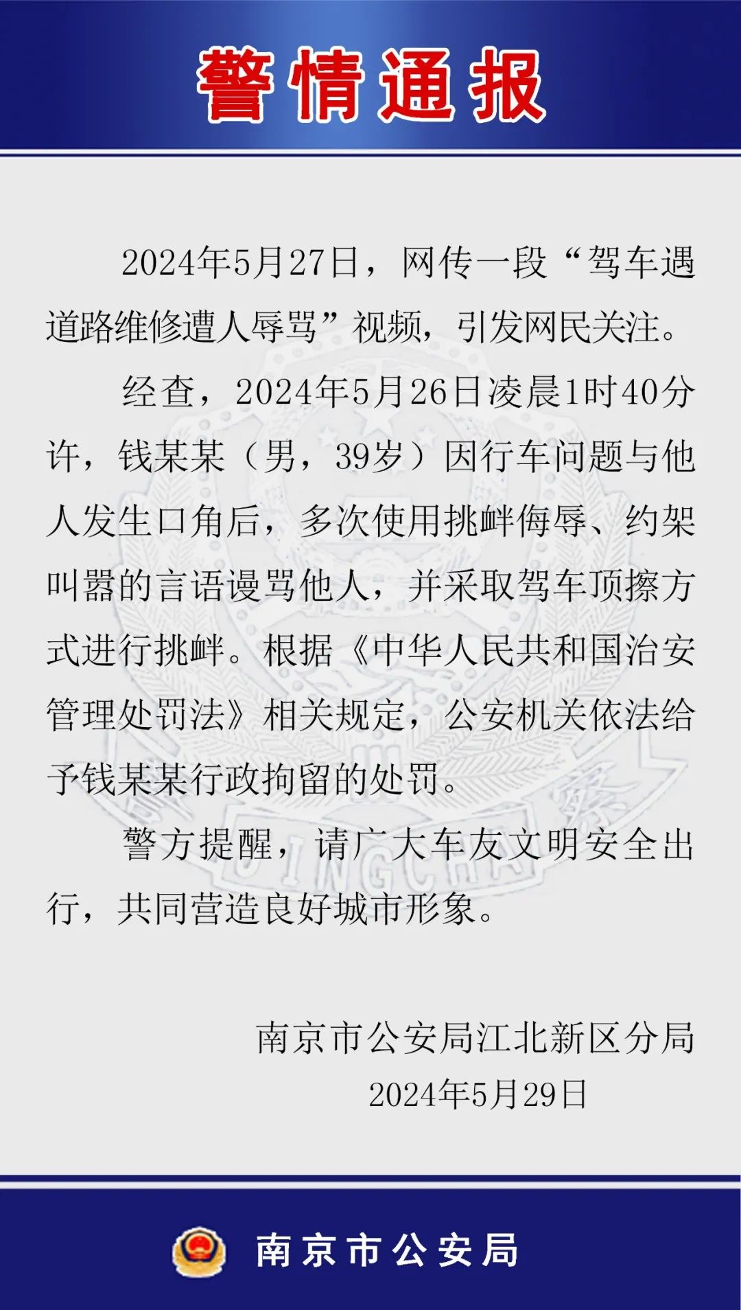 央視網(wǎng)消息:據(jù)“南京警方”微信公眾號消息,5月29日,南京市公安局江北新區(qū)分局通報,5月27日,網(wǎng)傳一段“駕車遇道路維修遭人辱罵”視頻,引發(fā)網(wǎng)民關(guān)注。經(jīng)查,2024年5月26日凌晨1時40分許,錢某某(男,39歲)因行車問題與他人發(fā)生口角后,多次使用挑釁侮辱、約架叫囂的言語謾罵他人,并采取駕車頂擦方式進(jìn)行挑釁。根據(jù)《中華人民共和國治安管理處罰法》相關(guān)規(guī)定,公安機(jī)關(guān)依法給予錢某某行政拘留的處罰。