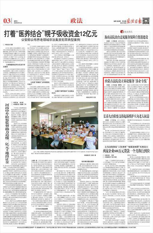 2025年8月12日,《法治日?qǐng)?bào)》第3版刊發(fā)題為《內(nèi)蒙古法院設(shè)立訴訟服務(wù)“涉企專線”》的文章,報(bào)道了自治區(qū)高院在全區(qū)法院集中開展規(guī)范涉企執(zhí)法司法專項(xiàng)行動(dòng)以來,全區(qū)法院認(rèn)真查糾立案環(huán)節(jié),全面查糾案件審理,深入開展“公開透明 規(guī)范高效”提升年行動(dòng)。