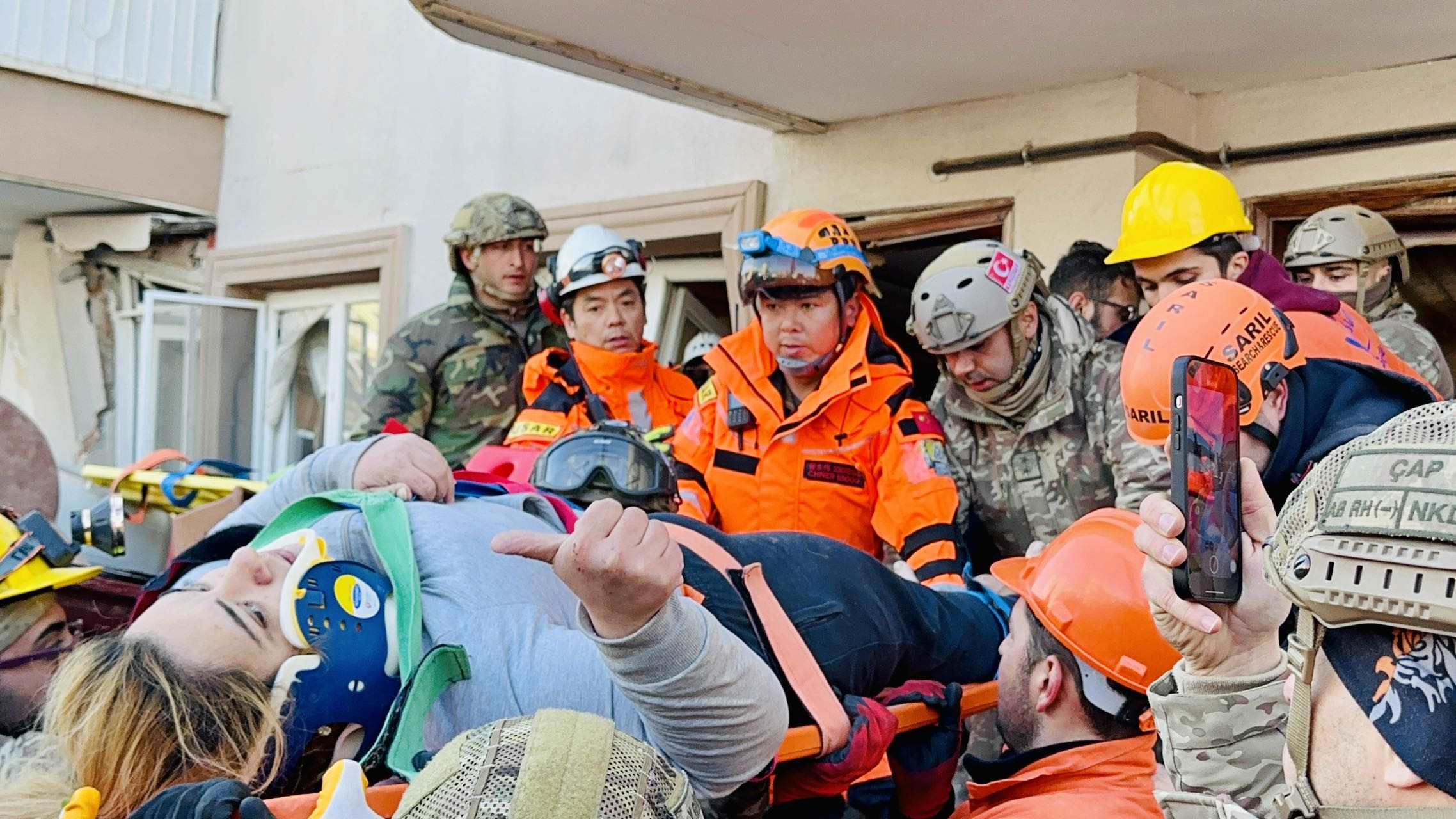 被救出的女性向救援人員豎起大拇指。公羊救援隊(duì)供圖