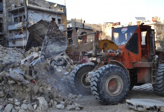 2月9日,大型機(jī)械在敘利亞阿勒頗參與救援。新華社發(fā)