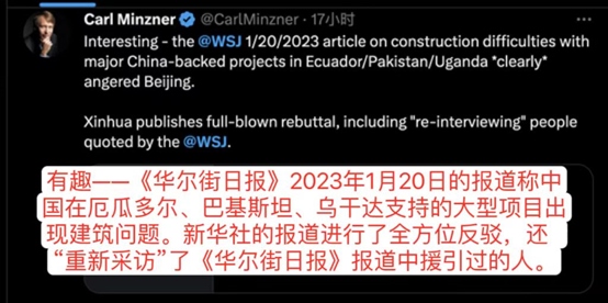 美國(guó)福特漢姆大學(xué)教授、美國(guó)外交關(guān)系協(xié)會(huì)中國(guó)問題高級(jí)研究員明克勝轉(zhuǎn)發(fā)了新華社的報(bào)道,并稱:有趣——《華爾街日?qǐng)?bào)》2023年1月20日的報(bào)道稱中國(guó)在厄瓜多爾、巴基斯坦、烏干達(dá)支持的大型項(xiàng)目出現(xiàn)建筑問題。新華社的報(bào)道進(jìn)行了全方位反駁,還“重新采訪”了《華爾街日?qǐng)?bào)》報(bào)道中援引過的人。