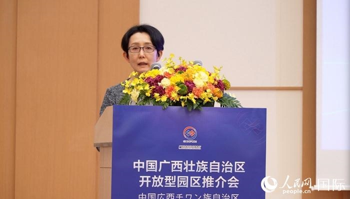 中國(guó)(廣西)自由貿(mào)易試驗(yàn)區(qū)工作辦公室專(zhuān)職副主任白嵐做主題推介時(shí),向日本經(jīng)濟(jì)產(chǎn)業(yè)界分享了廣西的四大發(fā)展機(jī)遇。