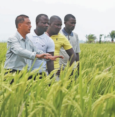 2022年10月29日,中國(guó)水稻專家但松柏(左一)在布隆迪布班扎省基航加縣指導(dǎo)當(dāng)?shù)剞r(nóng)民種植水稻。董江輝攝(新華社發(fā))