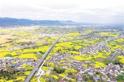 |   陜西省漢中市南鄭區(qū)岳家?guī)X村,一列動(dòng)車組列車在金燦燦的油菜花海中穿行。 曹 欣攝(人民視覺)  |