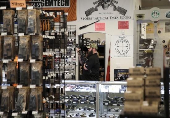 2017年10月4日,在美國(guó)拉斯維加斯的“新前線”槍械商店,一名店員為顧客展示槍支?!靶虑熬€”是當(dāng)?shù)匾?guī)模較大的一家槍械商店,售賣槍支彈藥、槍周邊用品、槍文化衍生品等。新華社記者王迎攝