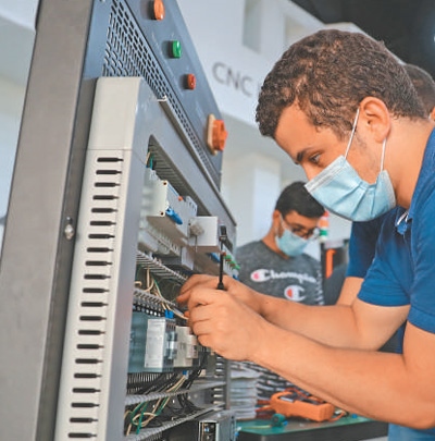2022年8月16日,在位于埃及首都開羅的艾因夏姆斯大學魯班工坊,學生正在學習電路連接。 新華社記者 隋先凱攝