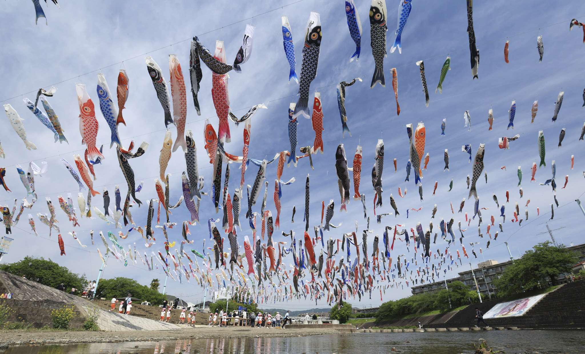 當(dāng)?shù)貢r間2023年4月28日,日本大阪,大約1000條鯉魚旗在高摫市的秋田川河上空飄揚(yáng),慶祝5月5日兒童節(jié)。視覺中國