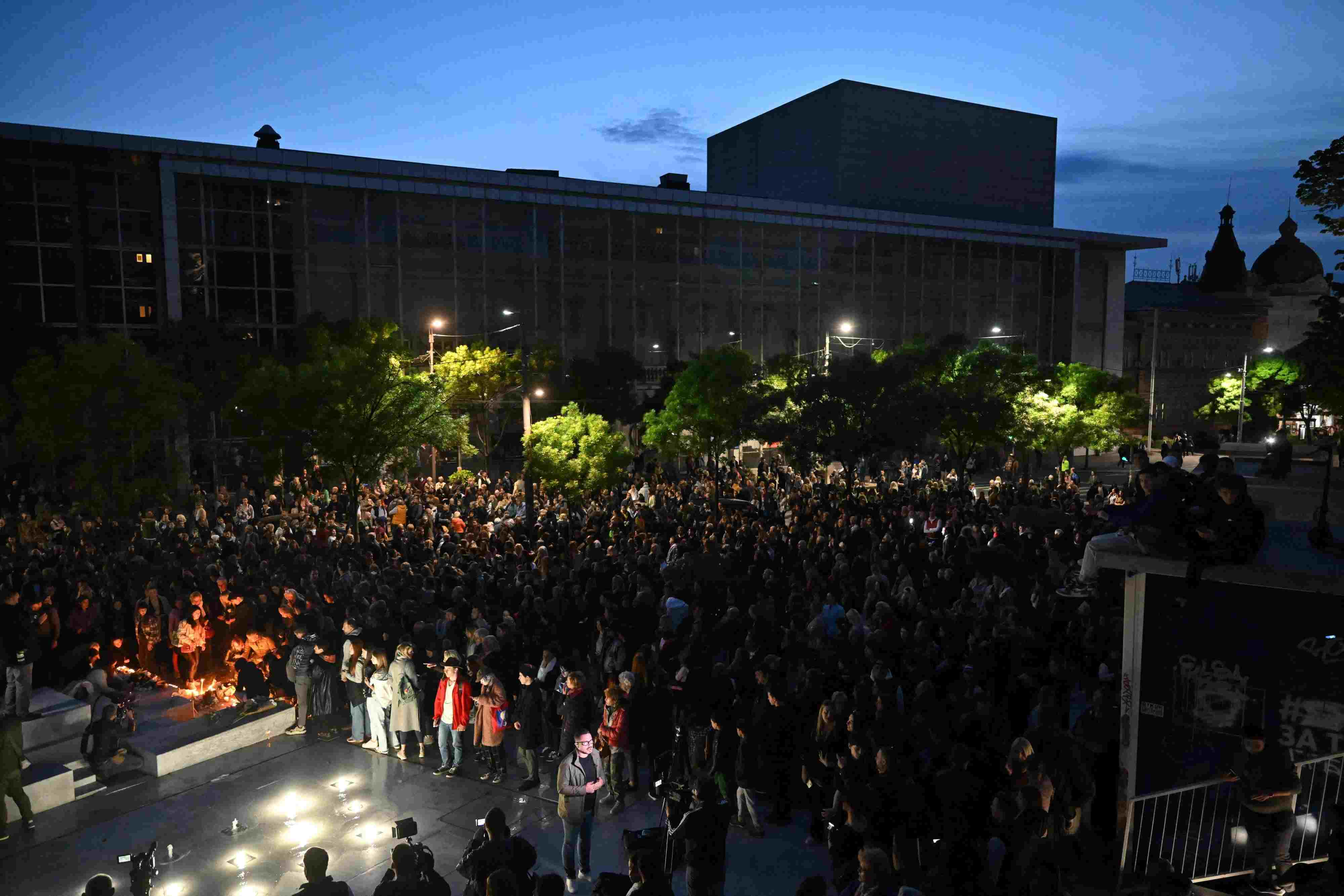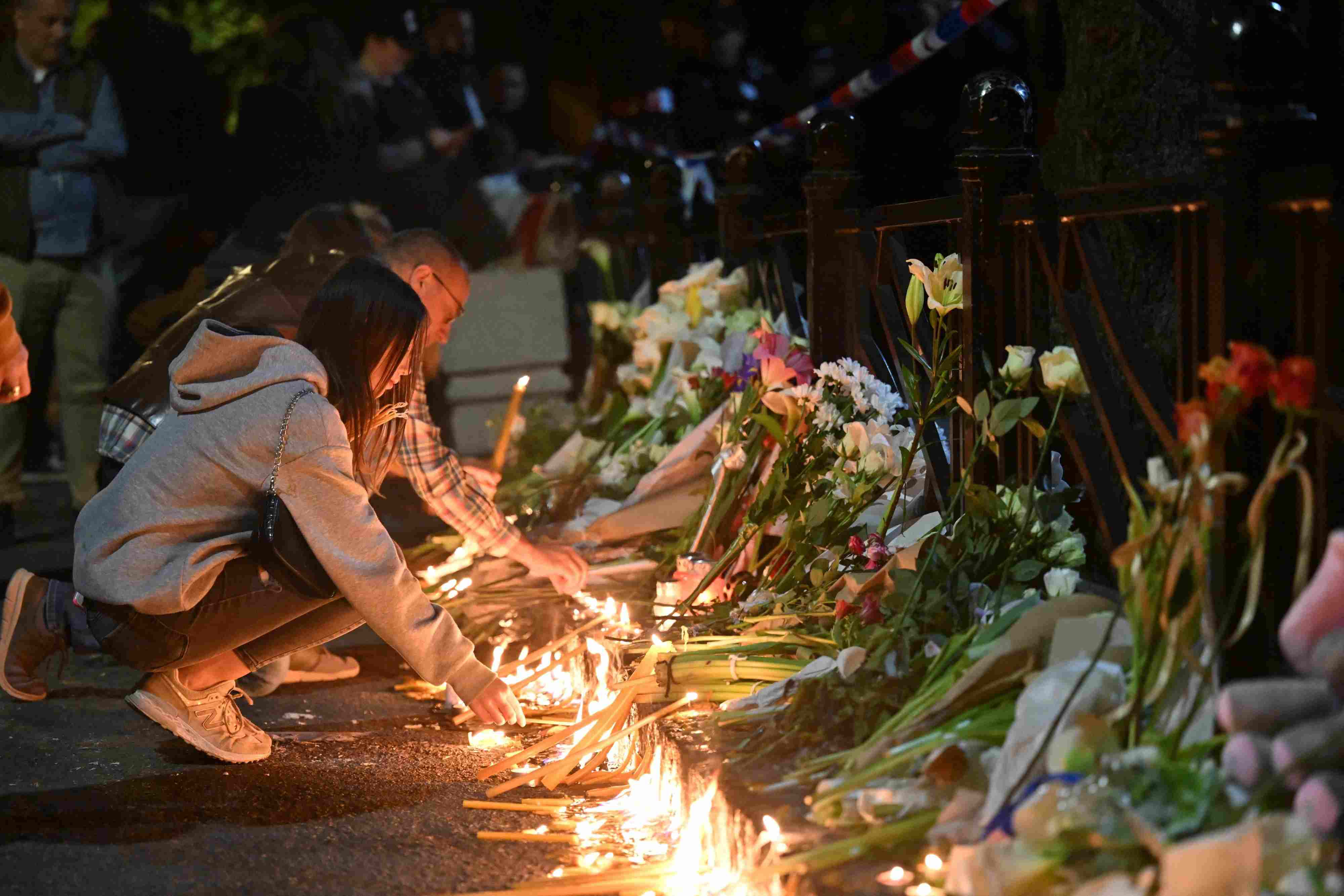 當(dāng)?shù)貢r(shí)間2023年5月3日,塞爾維亞貝爾格萊德,人們?cè)趯W(xué)校門(mén)前悼念遇難者。