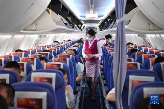 5月13日,在西安-烏魯木齊-阿什哈巴德首趟航班上,乘務(wù)員在起飛前進(jìn)行客艙安全檢查。