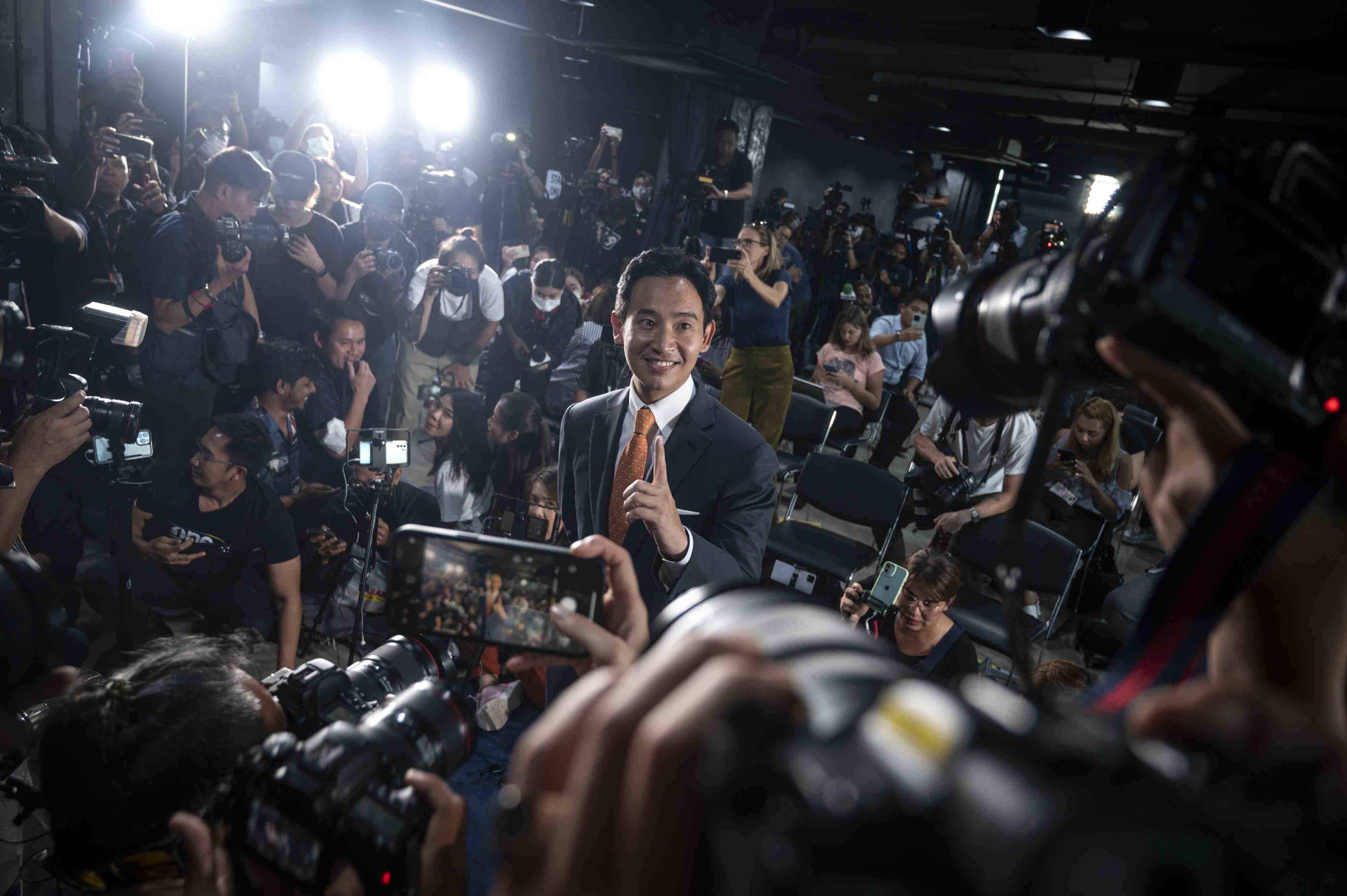 當(dāng)?shù)貢r(shí)間2023年5月15日,泰國曼谷,泰國遠(yuǎn)進(jìn)黨黨魁皮塔在該黨總部舉行記者招待會(huì)。當(dāng)日中午,在泰國國會(huì)下議院選舉中獲得選票數(shù)和下議院席位數(shù)暫時(shí)領(lǐng)先的遠(yuǎn)進(jìn)黨黨魁皮塔宣布遠(yuǎn)進(jìn)黨在此次選舉中獲勝,已經(jīng)做好組建新一屆政府的準(zhǔn)備,自己也已準(zhǔn)備好擔(dān)任總理一職。 視覺中國