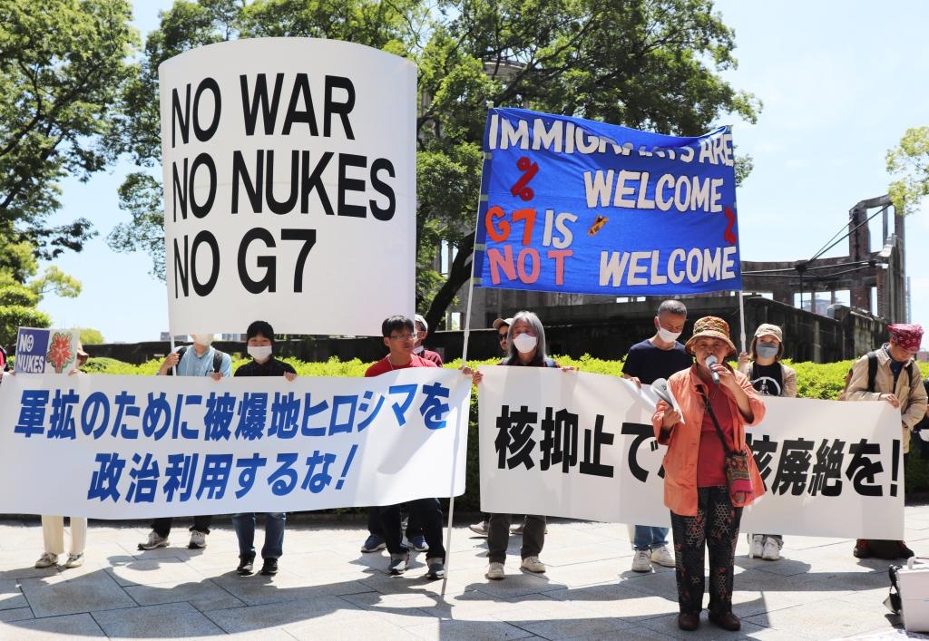 5月14日,在日本廣島街頭,日本民眾舉著“不要戰(zhàn)爭(zhēng)、不要核武器、不要G7”等標(biāo)語,強(qiáng)烈抗議七國(guó)集團(tuán)(G7)峰會(huì)將在廣島召開。新華社記者楊光攝