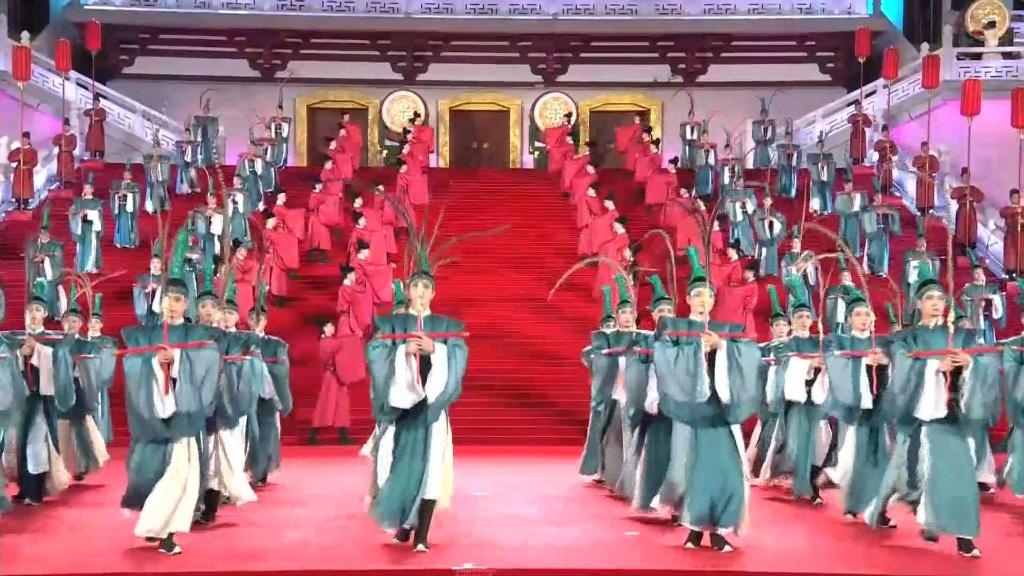 紫云樓前,禮樂和鳴,明快有力的古代佾舞、絢麗婀娜的芙蓉花舞,表達了古都西安人民的熱情好客,體現(xiàn)了中華文化兼容并蓄的精神風貌。