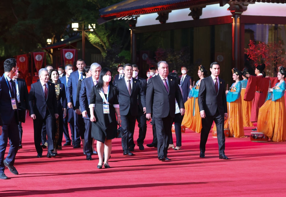 哈薩克斯坦總統(tǒng)托卡耶夫、吉爾吉斯斯坦總統(tǒng)扎帕羅夫和夫人扎帕羅娃、塔吉克斯坦總統(tǒng)拉赫蒙、土庫曼斯坦總統(tǒng)別爾德穆哈梅多夫、烏茲別克斯坦總統(tǒng)米爾濟約耶夫和夫人米爾濟約耶娃抵達(dá)紫云樓前。