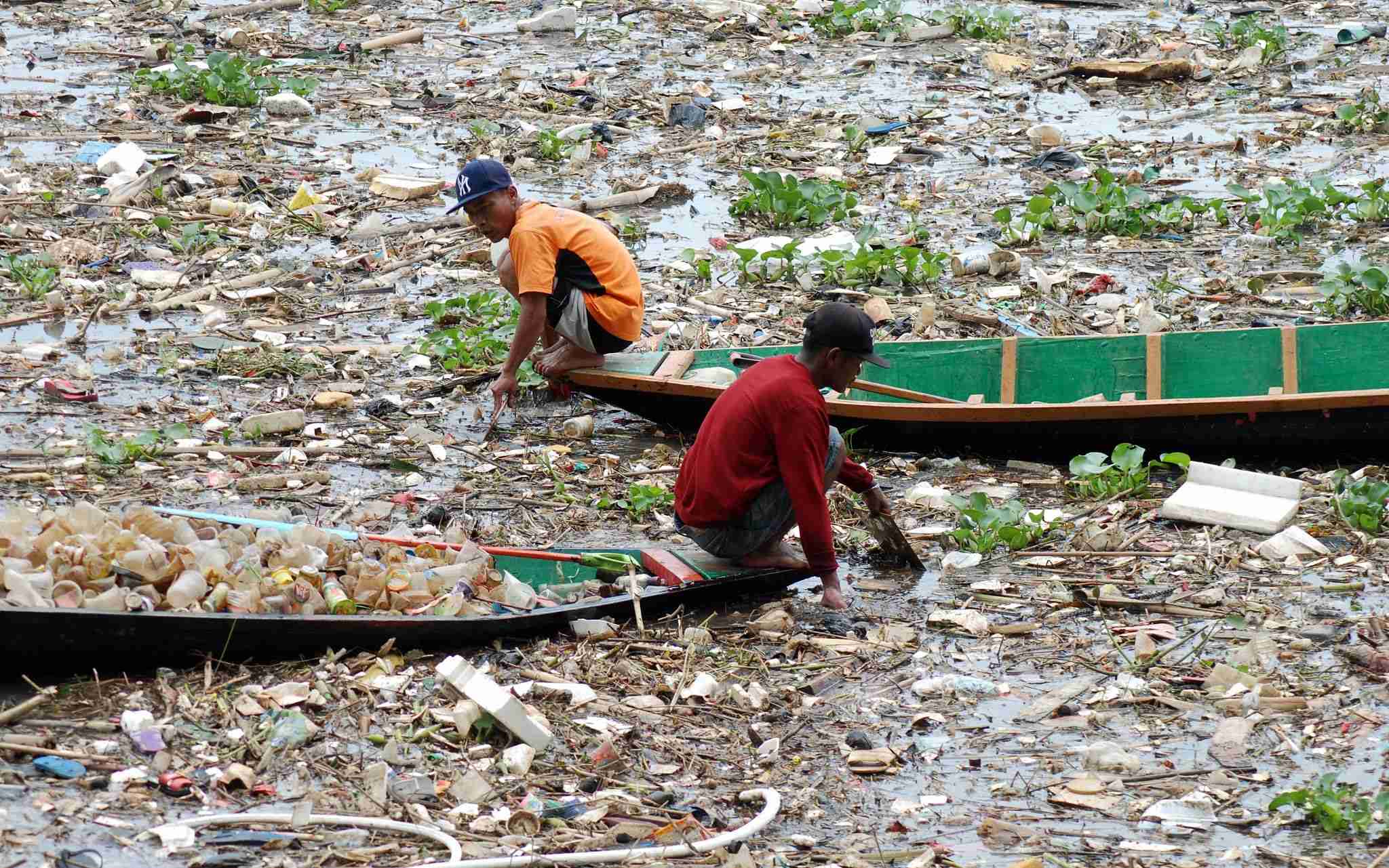 當(dāng)?shù)貢r間2023年3月28日,印度尼西亞萬隆,兩名工人在芝塔龍河道中收集塑料。