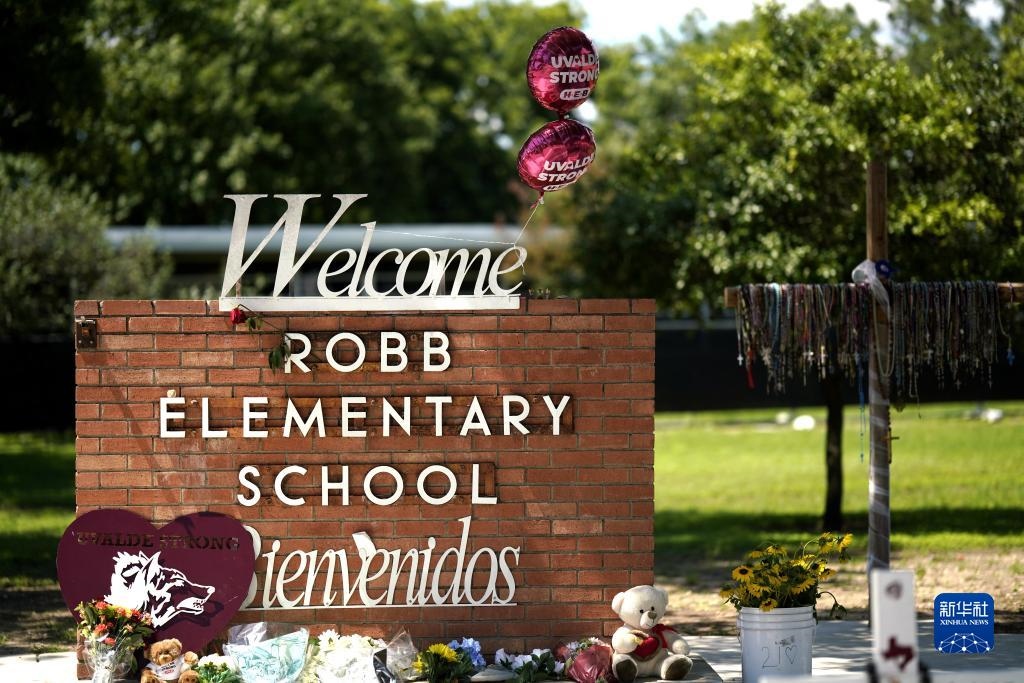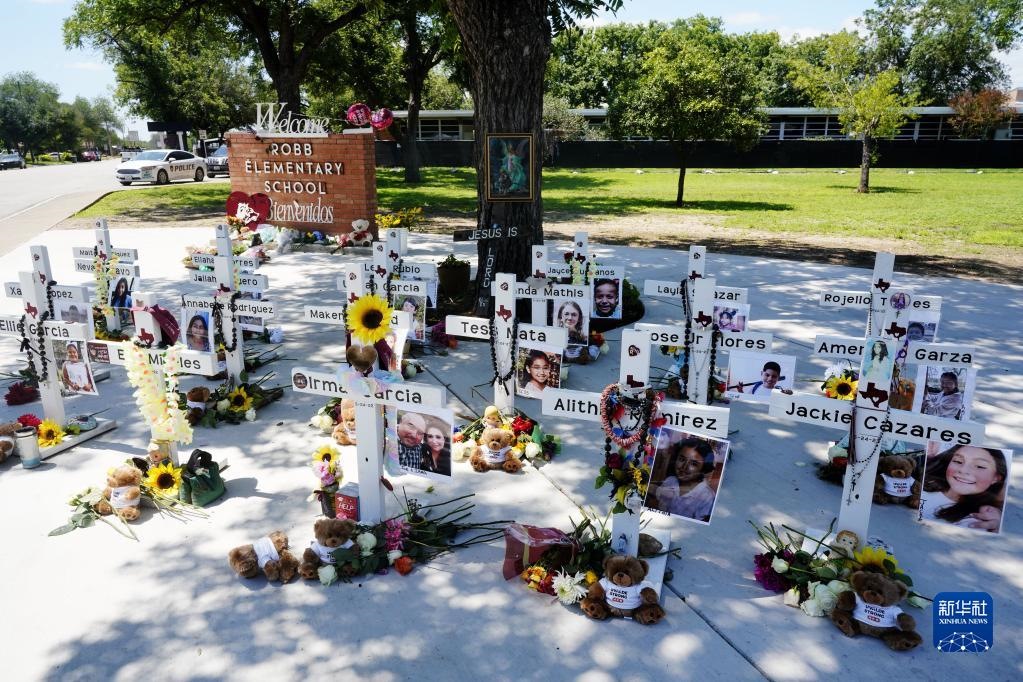 5月24日,美國(guó)得克薩斯州小城尤瓦爾迪的原羅布小學(xué)外擺放著悼念槍擊遇害者的物品。