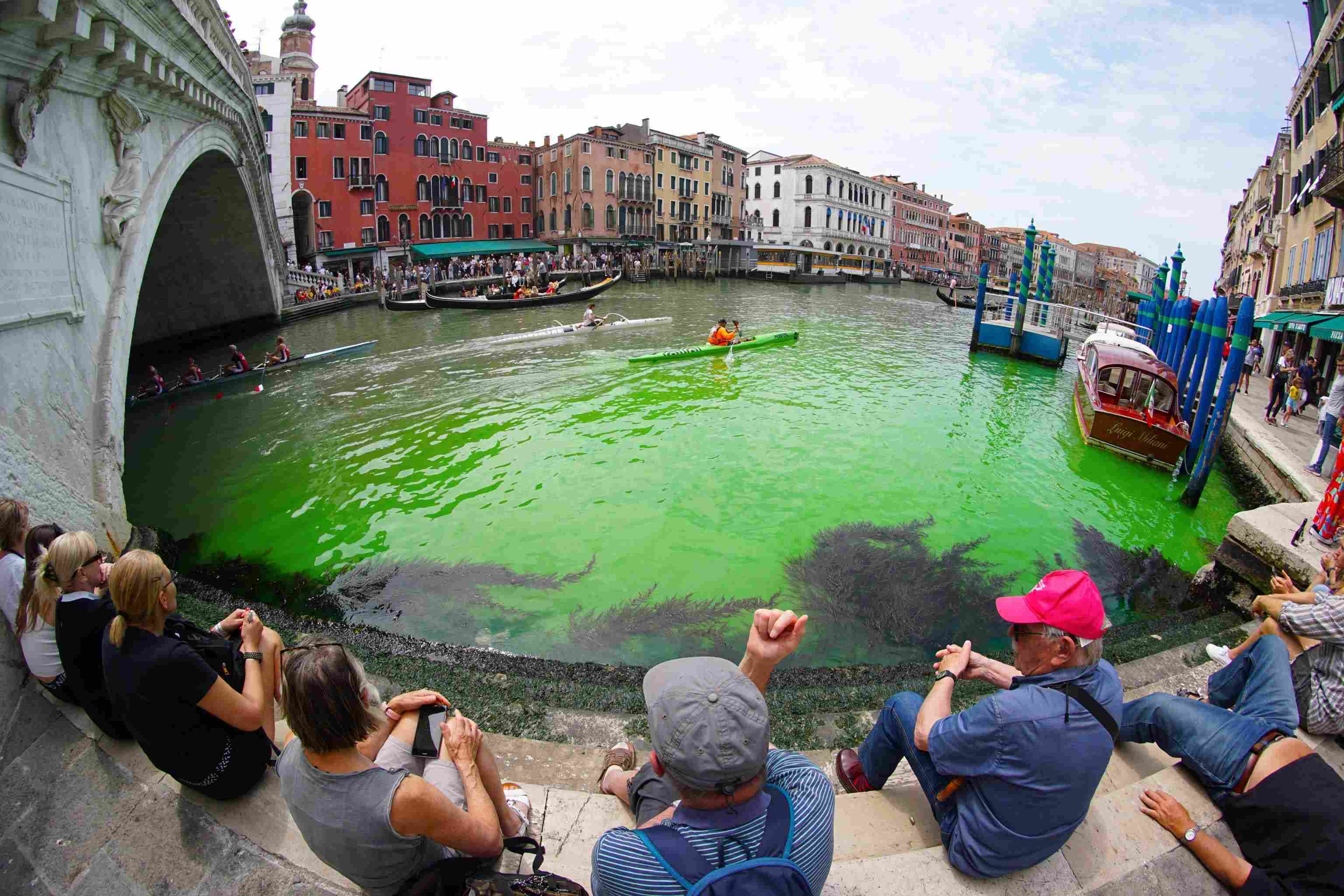 當(dāng)?shù)貢r(shí)間2023年5月28日,意大利威尼斯大運(yùn)河里亞托橋附近水域變成了熒光綠的顏色,警方等部門(mén)已經(jīng)介入調(diào)查,尋找原因。 視覺(jué)中國(guó)