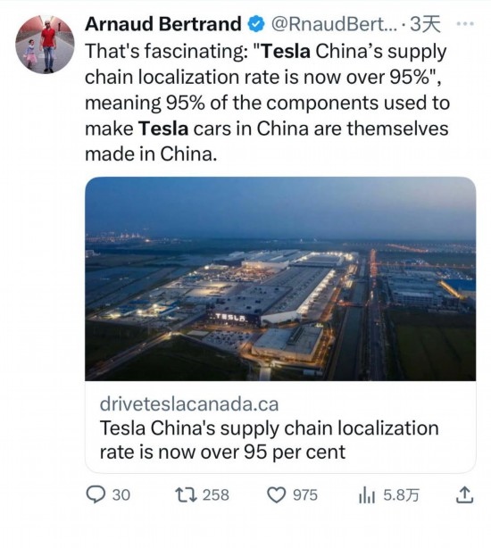 貝特朗還常為中國發(fā)展“點(diǎn)贊”。他在轉(zhuǎn)發(fā)特斯拉上海超級(jí)工廠新聞時(shí)由衷贊嘆:“真是太厲害了,這表示在中國生產(chǎn)特斯拉汽車所用的95%的零部件都是中國制造。”(參與記者:陳紹華、張曼;視頻:淡然、王沛;編輯:魯豫、王豐豐、杜逾舸、孫浩)