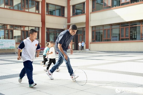 圖為沙杰和午亭小學(xué)的學(xué)生一起玩滾鐵圈。人民網(wǎng) 盧鵬宇攝