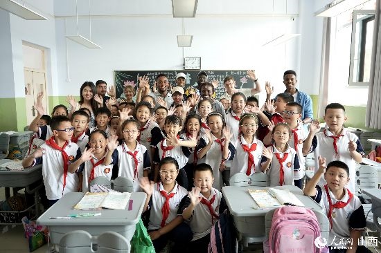 圖為選手和午亭小學(xué)的學(xué)生合影留念。人民網(wǎng) 盧鵬宇攝