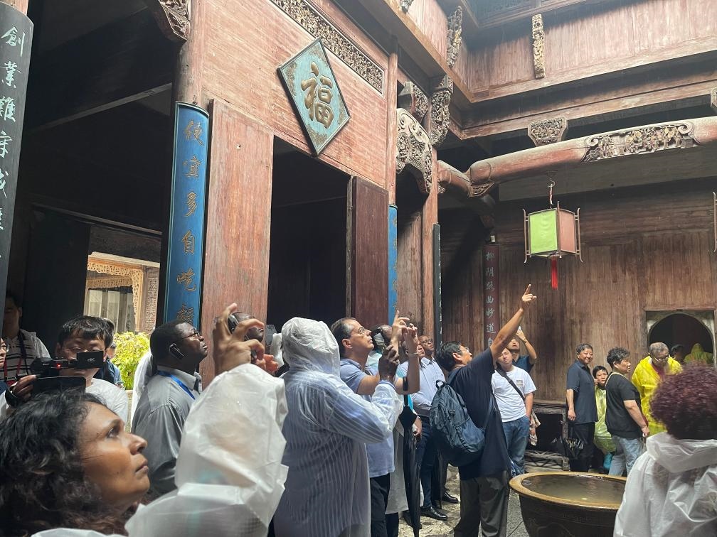 秋雨連綿中,使節(jié)們來(lái)到世界文化遺產(chǎn)地宏村。被雨水打濕的蓮葉搖曳在微涼的風(fēng)中,青石板路在雨中泛起柔和的光,徽派建筑的粉墻黛瓦在雨中顯得格外寧?kù)o淡雅,一幅悠然的水墨畫(huà)躍然眼中。樂(lè)敘堂、敦厚堂、敬德堂……古建筑承載的厚重中華文化令使節(jié)們沉醉其中。