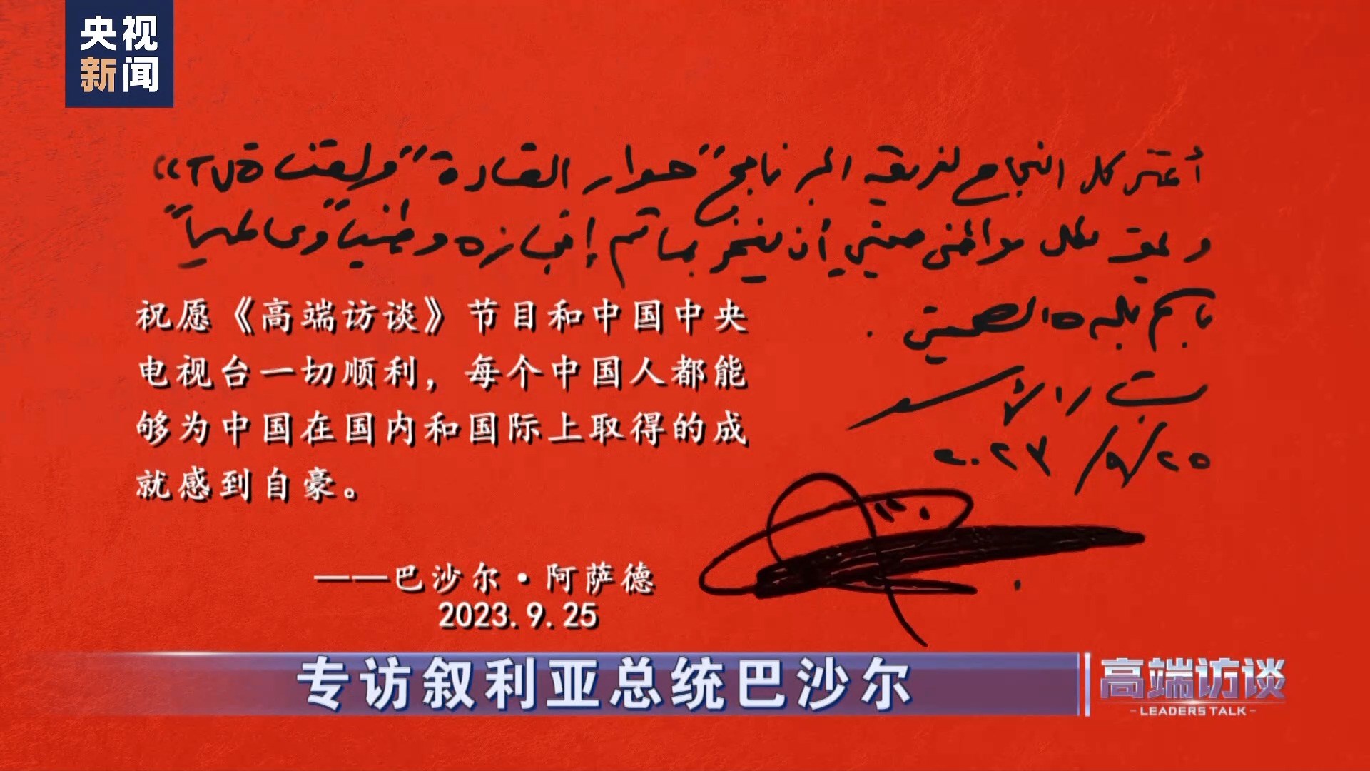 敘利亞總統(tǒng)巴沙爾在接受總臺專訪后題詞:祝愿《高端訪談》節(jié)目和中國中央電視臺一切順利,每個中國人都能夠為中國在國內和國際上取得的成就感到自豪!