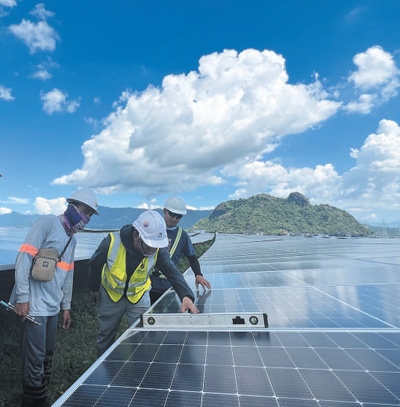 菲律賓圣馬塞利諾光伏項目由中國電力建設集團有限公司承建,項目建成后將成為該國最大的光伏電站,每年將為菲律賓供電5.9億千瓦時。圖為中方工程師(中)帶領菲方工作人員檢查調試光伏支架。楊獲然攝